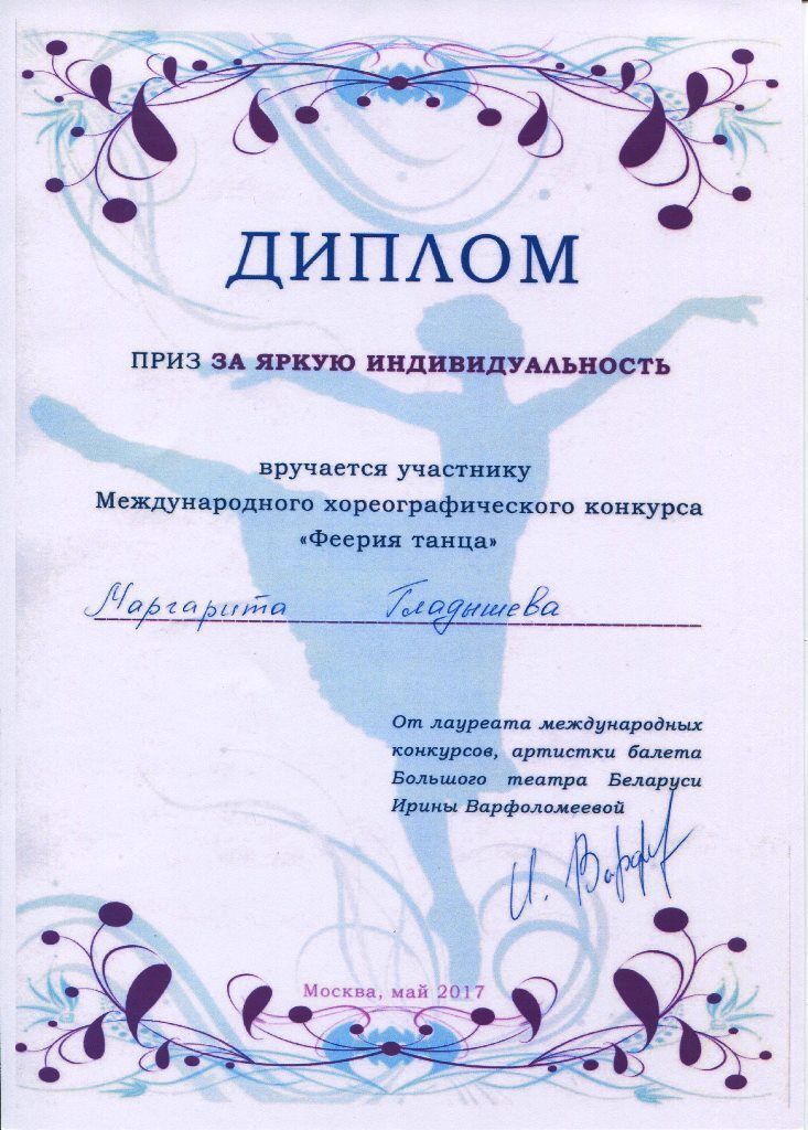 28 апреля - 02 мая 2017 года. Диплом Гладышевой Маргариты за яркую индивидуальность в Международном хореографическом конкурсе "Феерия танца"