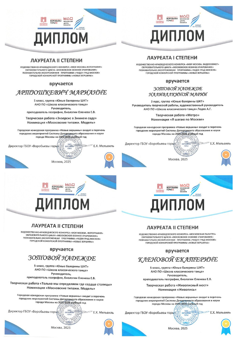 Лауреата I степени - Зотова Надежда и Наливалкина Мария в Художественно - краеведческом конкурсе «Моя Москва. Видеосюжет» - за работу «Метро» в номинации « Я шагаю по москве»