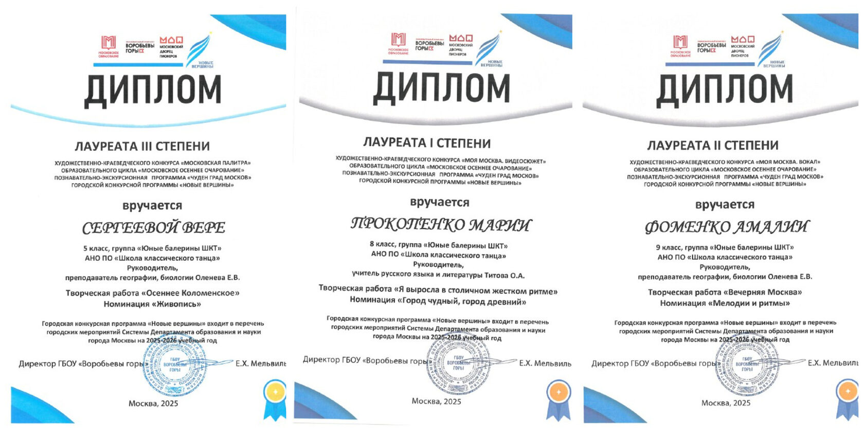 Лауреата II степени Фоменко Амалия в Художественно - краеведческом конкурсе «Моя Москва. Вокал» за работу «Вечерняя Москва» в номинации «Мелодии и ритмы»