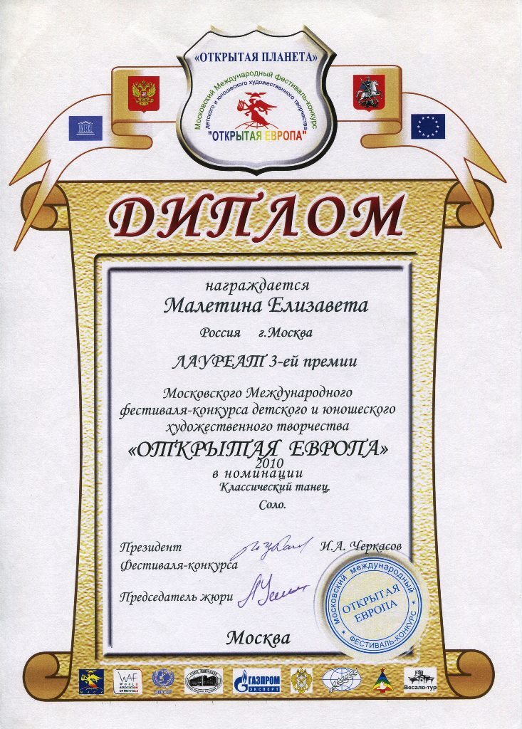 Диплом лауреата 3-ей премии Малетиной Елизаветы в номинации "Классический танец" - соло Московского Международного фестиваля-конкурса детского и юношеского художественного творчества "Открытая Европа".