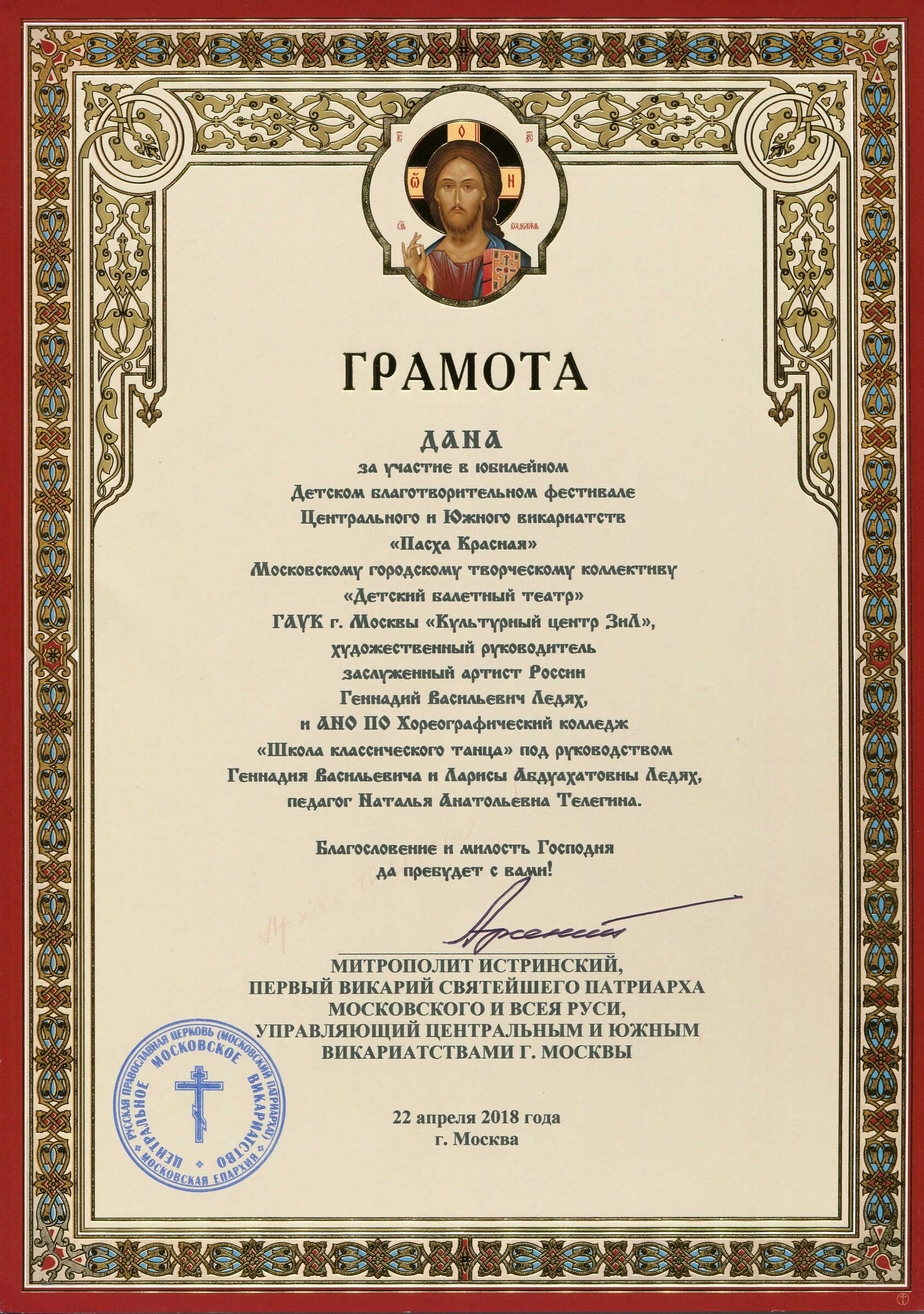 Грамота за участие в Детском благотворительном фестивале Центрального и Южного викариатств «Пасха Красная»