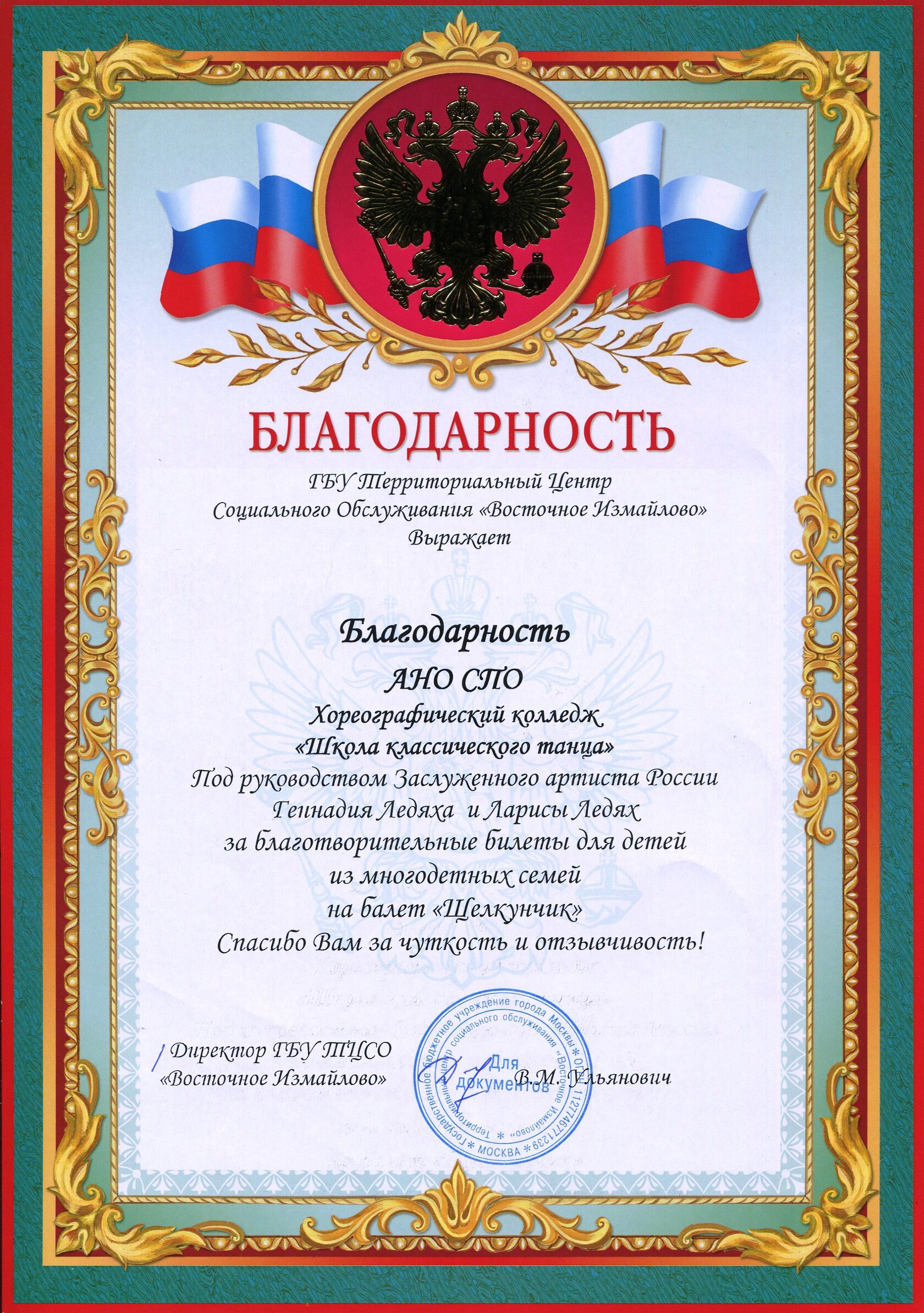 Благодарность от ГБУ Территориального центра Социального Обслуживания "Восточное Измайлово" за благотворительные билеты на балет "Щелкунчик".