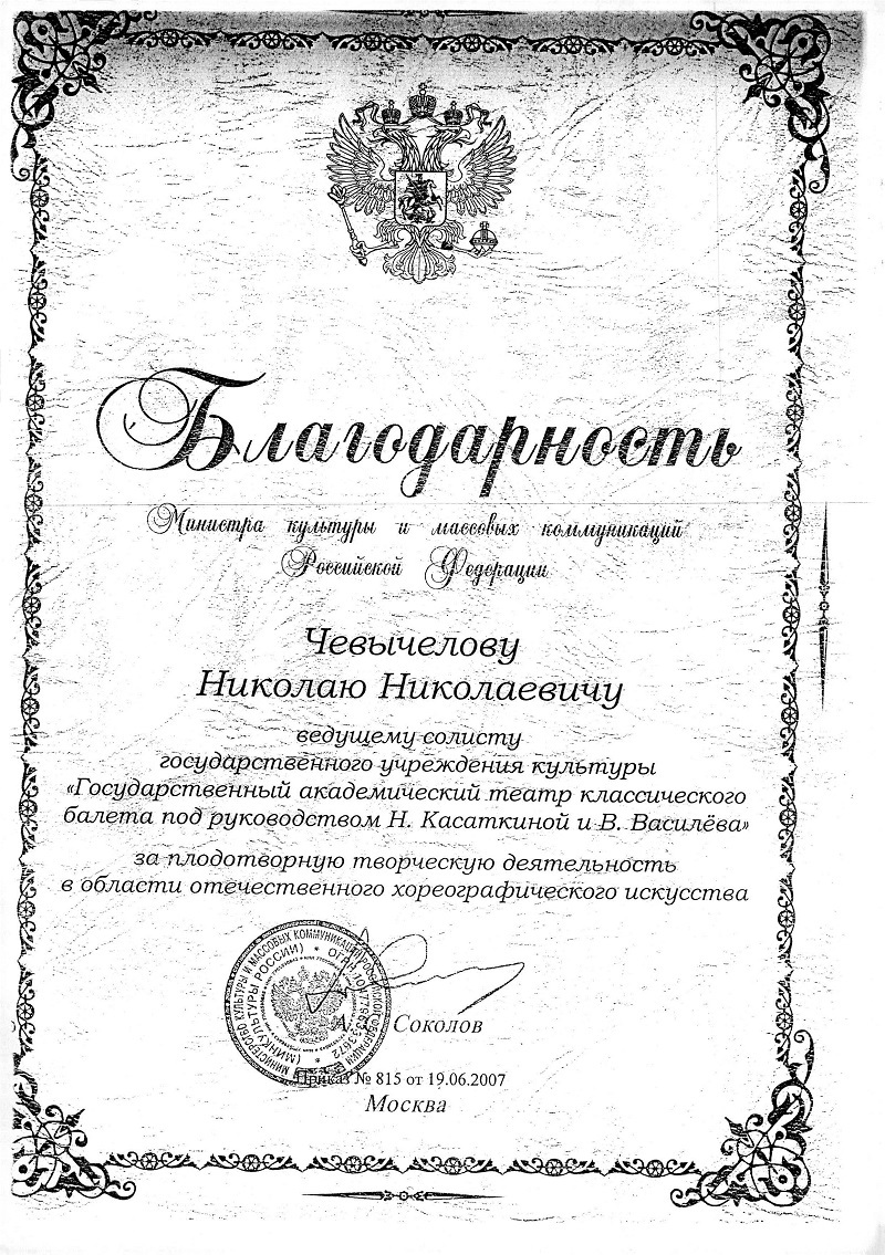 Николаю Чевычелову, за плодотворную творческую деятельность в области отечественного хореографического искусства
