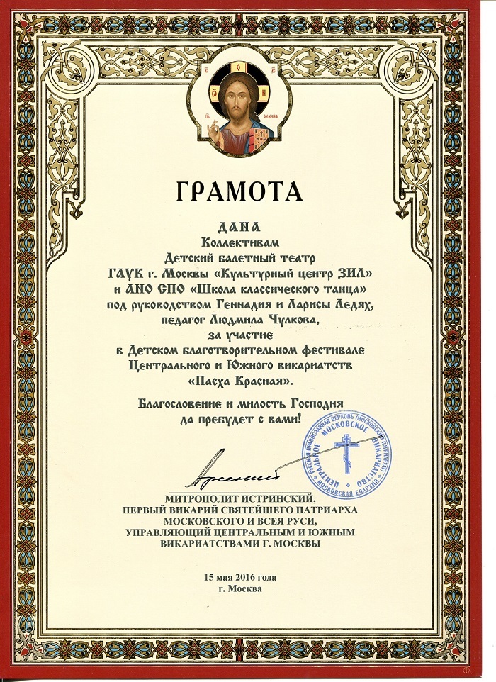 Грамота за участие в Детском благотворительном фестивале Центрального и Южного викариатств «Пасха Красная»