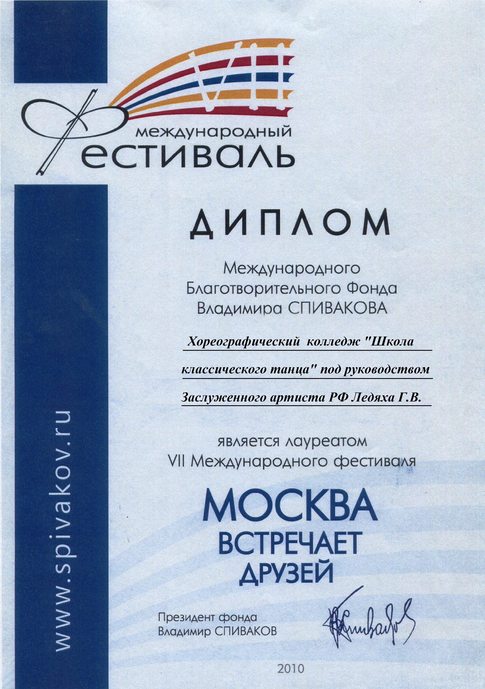 Диплом лауреата VII Международного фестиваля «Москва встречает друзей» Международного Благотворительного Фонда Владимира Спивакова Детского балетного театра.