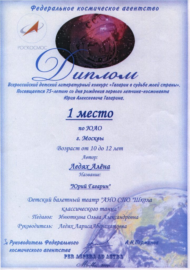 01 августа 2009 года. Диплом за I место Всероссийского детского литературного конкурса "Гагарин в судьбе моей страны!"
