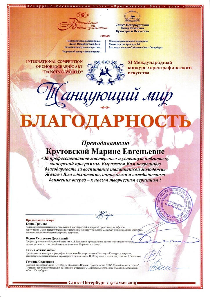 Благодарность преподавателю классического танца Крутовской М.Е."За профессиональное мастерство и успешную подготовку конкурсной программы" XI международного конкурса "Танцующий мир", который прошел в г. Санкт-Петербурге.