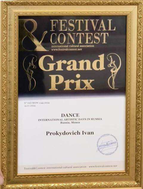 14 января 2024 года. Диплом ГРАН ПРИ - Ивана Прокудович Международного Фестиваль-Конкурса "FESTIVAL CONTEST ARTISTIC DAYS"