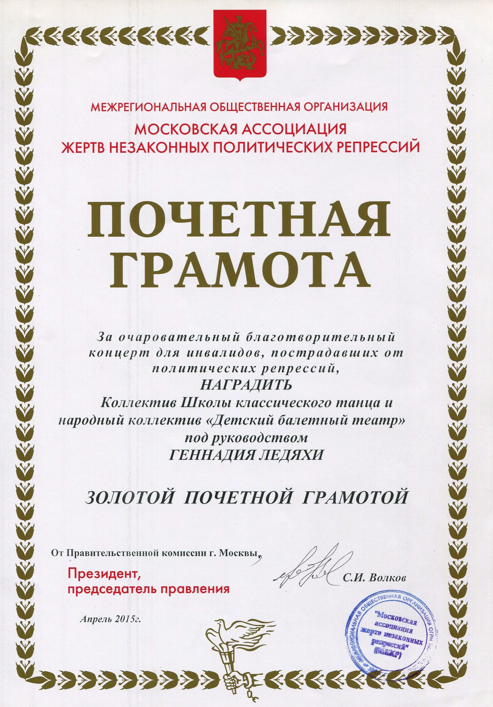 Золотая почетная грамота за благотворительный концерт для инвалидов, пострадавших от политических репрессий