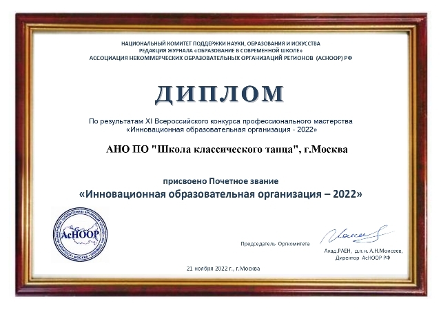Диплом "Школы классического танца" с присвоением Почетного звания "Инновационная образовательная организация - 2022"!