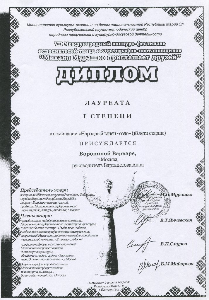 30 марта - 02 апреля 2017 года. Диплом лауреата I степени Ворониной Варвары в номинации "Народный танец-соло"