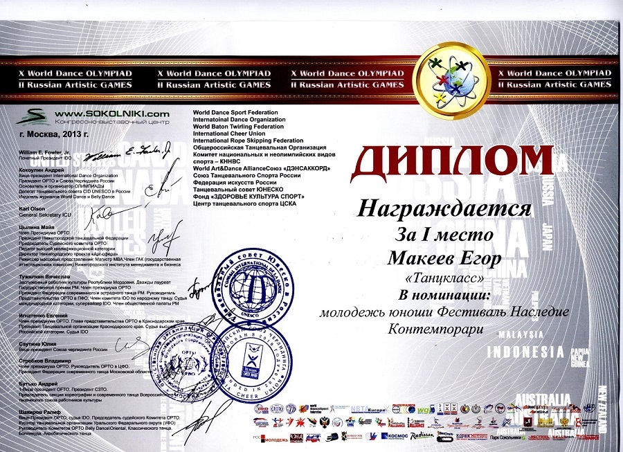 29 апреля-11 мая 2013 года. Диплом Макеева Егора за I место в номинации "Молодежь юноши Фестиваль Наследие Контемпорари" X World Dance OLYMPIAD (X Юбилейная Всемирная танцевальная Олимпиада 2013)