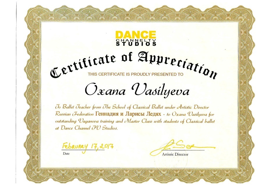 Сертификат Dance Channel TV Ballet Academy преподавателю Васильевой О.Г. о проведении мастер-класса в городе Энсино, Соединённые Штаты Америки
