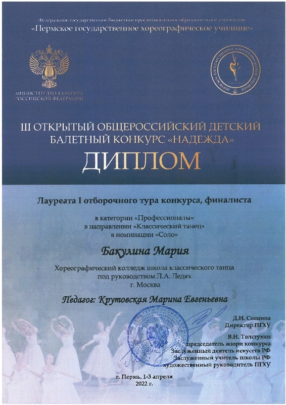 01-03 апреля 2022 года. Диплом Лауреата I отборочного тура, финалистки III Открытого общероссийского детского балетного конкурса "Надежда" Бакулиной Марии (преподаватель Крутовская М.Е.)
