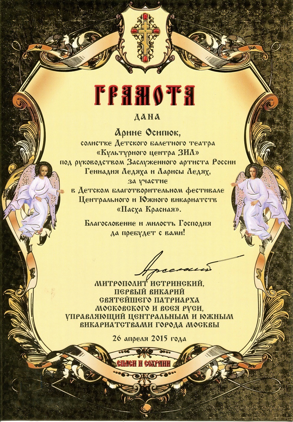 26 апреля 2015 года. Грамота Арины Осипюк за участие в Детском благотворительном фестивале Центрального и Южного викариатств "Пасха красная"