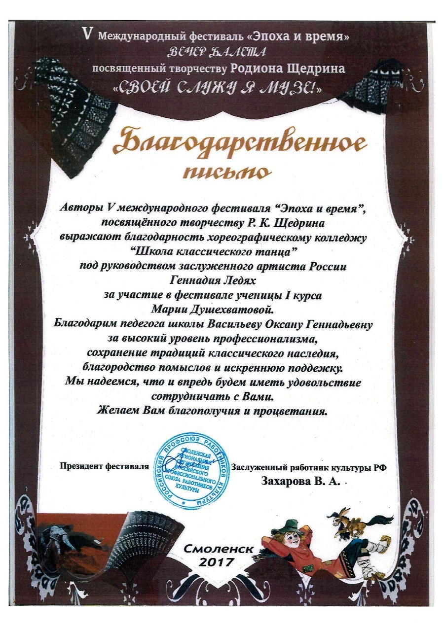 Благодарственное письмо за участие в V Международном фестивале «Эпоха и Время» и вечере балета, посвященному творчеству Родиона Щедрина.
