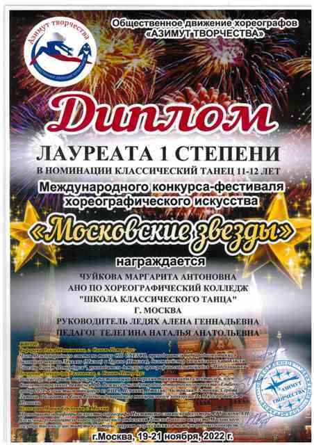 19-21 ноября 2022 года. Диплом Чуйковой Маргариты лауреата 1 степени Международного конкурса-фестиваля "Московские звезды"