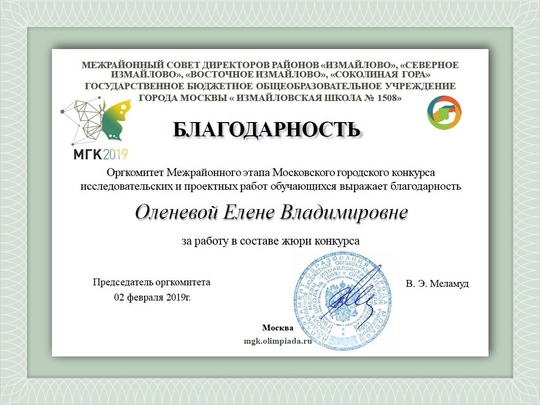 Благодарность преподавателю географии и биологии Оленевой Е.В. за работу в жюри Московского городского конкурса исследовательских и проектных работ.