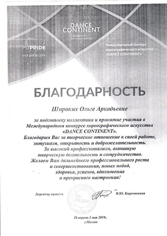Благодарность Широких О.А. за подготовку коллектива и принятия участия в Международном конкурсе хореографического искусства "Dance Continent"