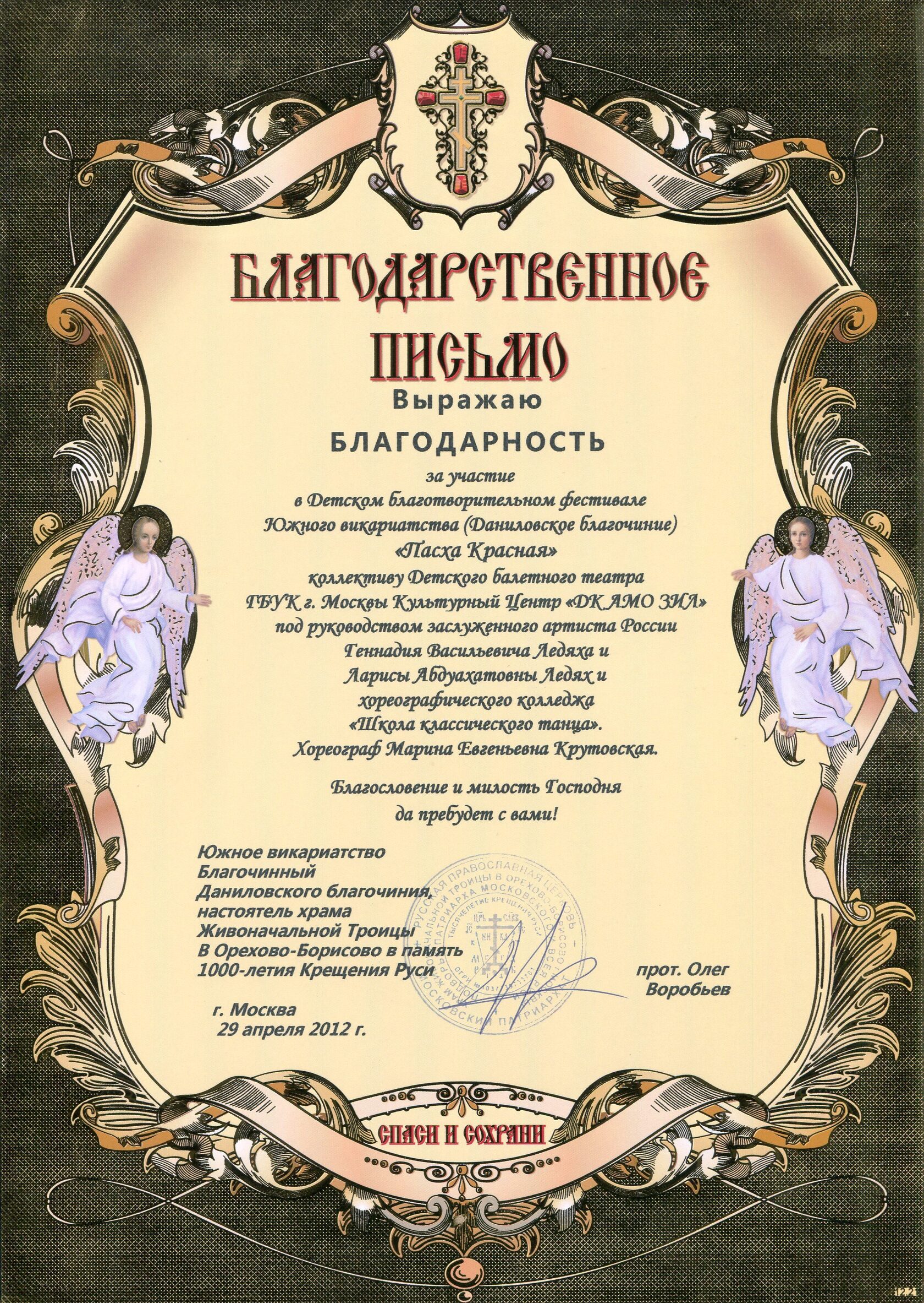 Благодарственное письмо за участие в Детском пасхальном фестивале Даниловского благочиния «Пасха Красная» Детскому балетному театру.