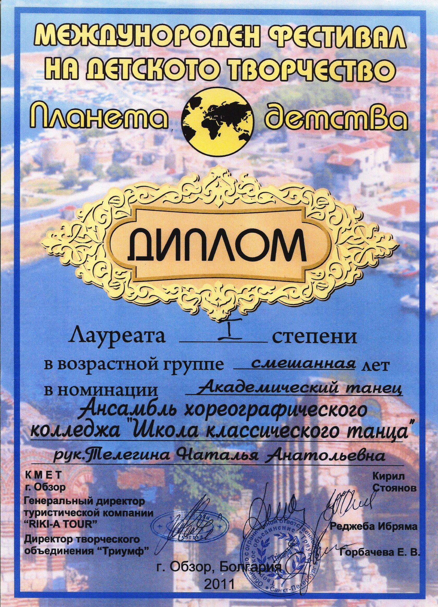 Болгария, г. Обзор. Диплом Лауреата I степени в номинации "Академический танец" за участие в VII Международном фестивале-конкурсе музыкально-художественного творчества "Планета детства".