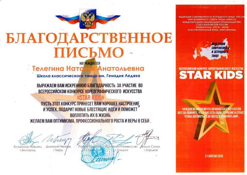 Благодарственное письмо Телегиной Н.А. за участие во всероссийском конкурсе хореографического искусства "STAR KIDS"
