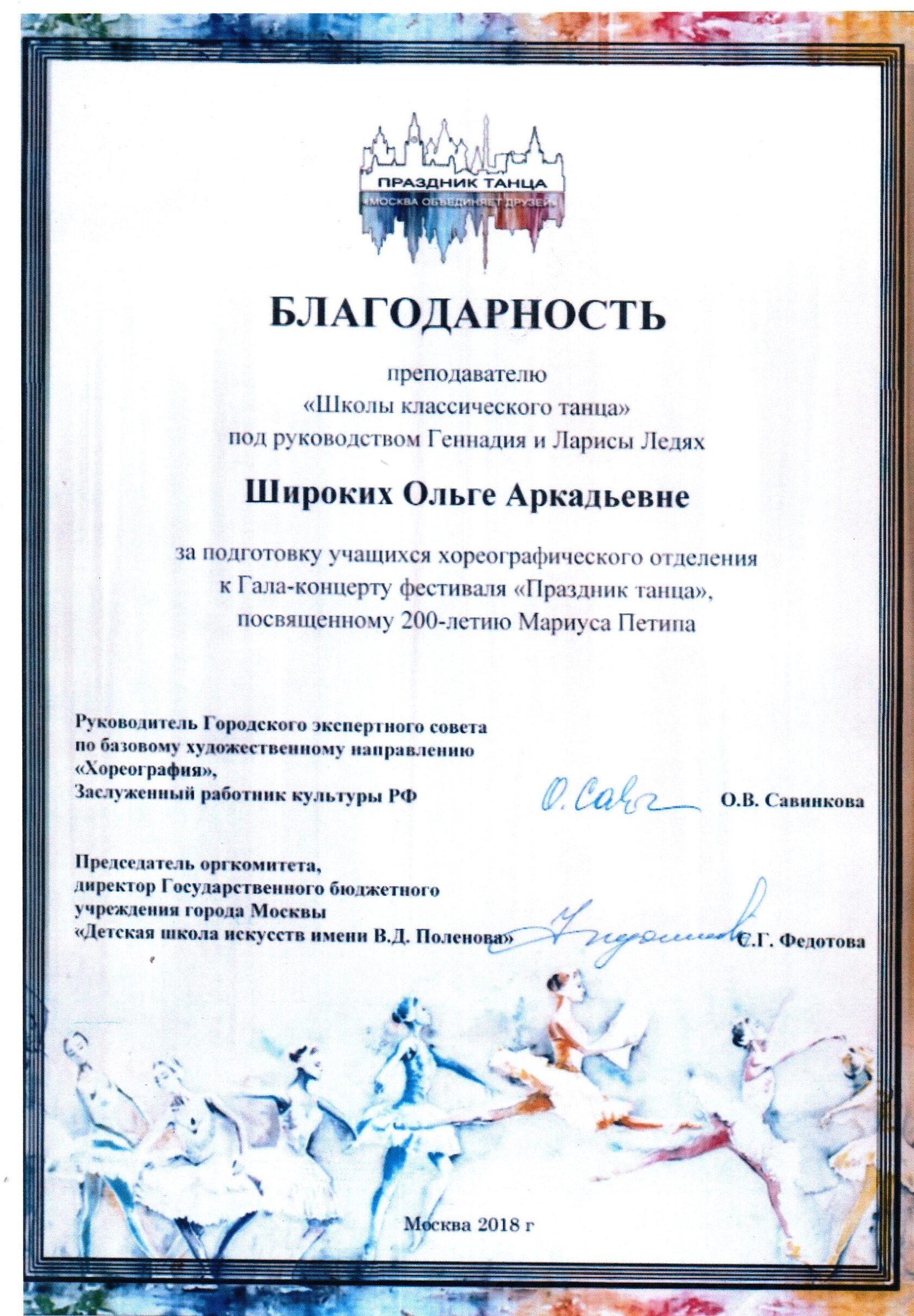 Благодарственное письмо от Детской школы искусств имени В.Д. Поленова за сотрудничество в организации "Праздника танца", посвященному 200-летию Мариуса Петипа