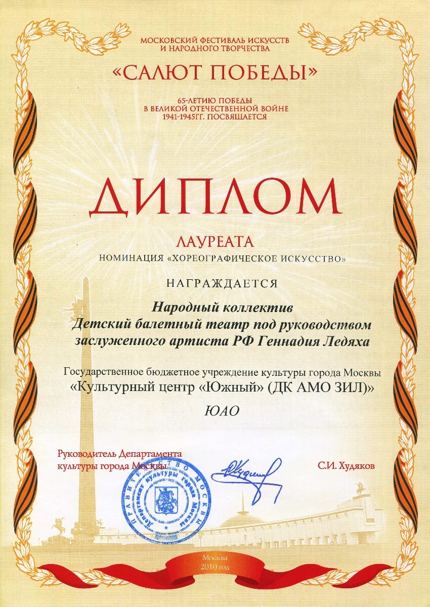 Диплом лауреата номинация "Хореографическое искусство" Московского фестиваля искусств и народного творчества «Салют Победы»