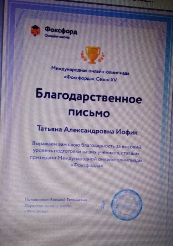 Благодарственное письмо Иофик Татьяны Александровны за высокий уровень подготовки наших учеников в Международной онлайн-олимпиаде по математике "Фоксфорда", сезон XV - базовый уровень.