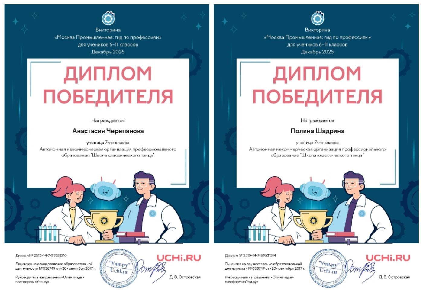 Декабрь 2025г. Дипломы Победителя Черепановой Анастасии и Шадриной Полины в Викторине "Москва промышленная: гид по профессиям"