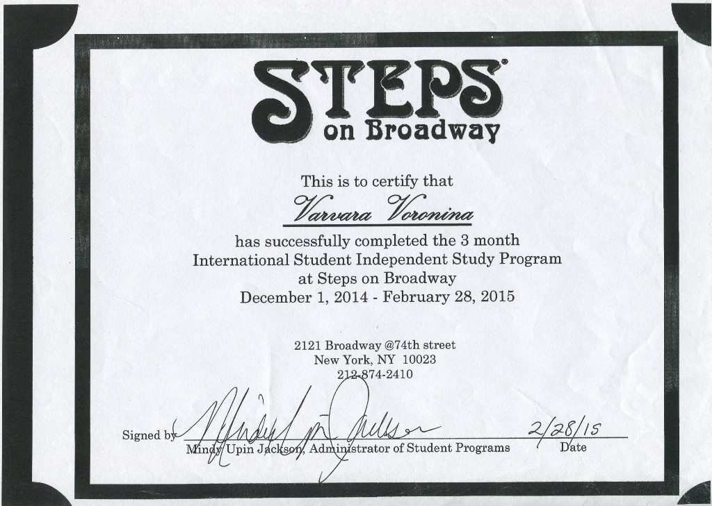 28 февраля 2015 года. Сертификат Ворониной Варвары о том, что она успешно завершила 3-месячную международную студенческую независимую учебную программу "Steps on Broadway" с 01.12.2014 по 28.02.2015 г