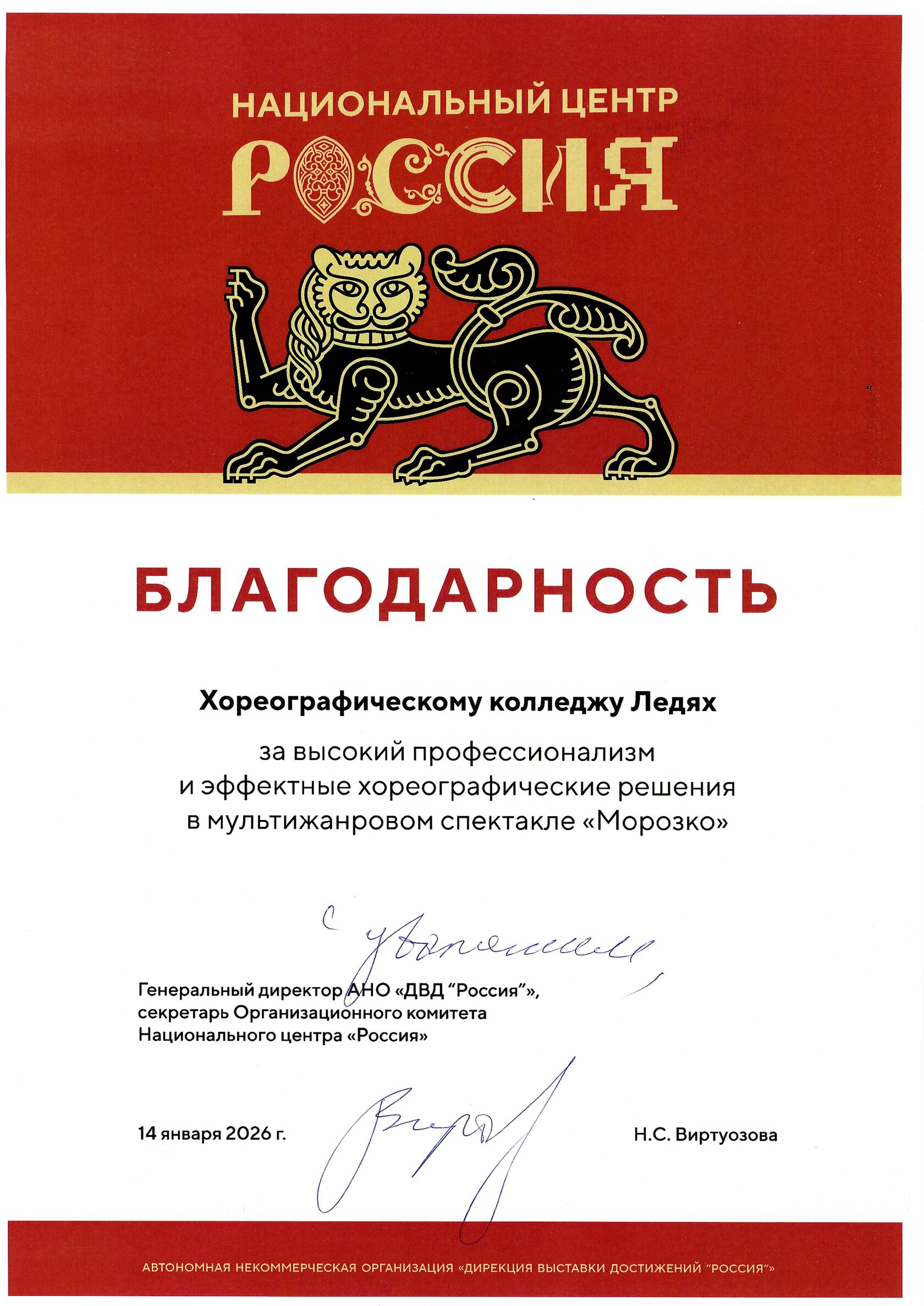 14.01.26г. Благдарность Колледжу от Национального центра Россия за высокий профессионализм в мультижанровом спектакле "Морозко"