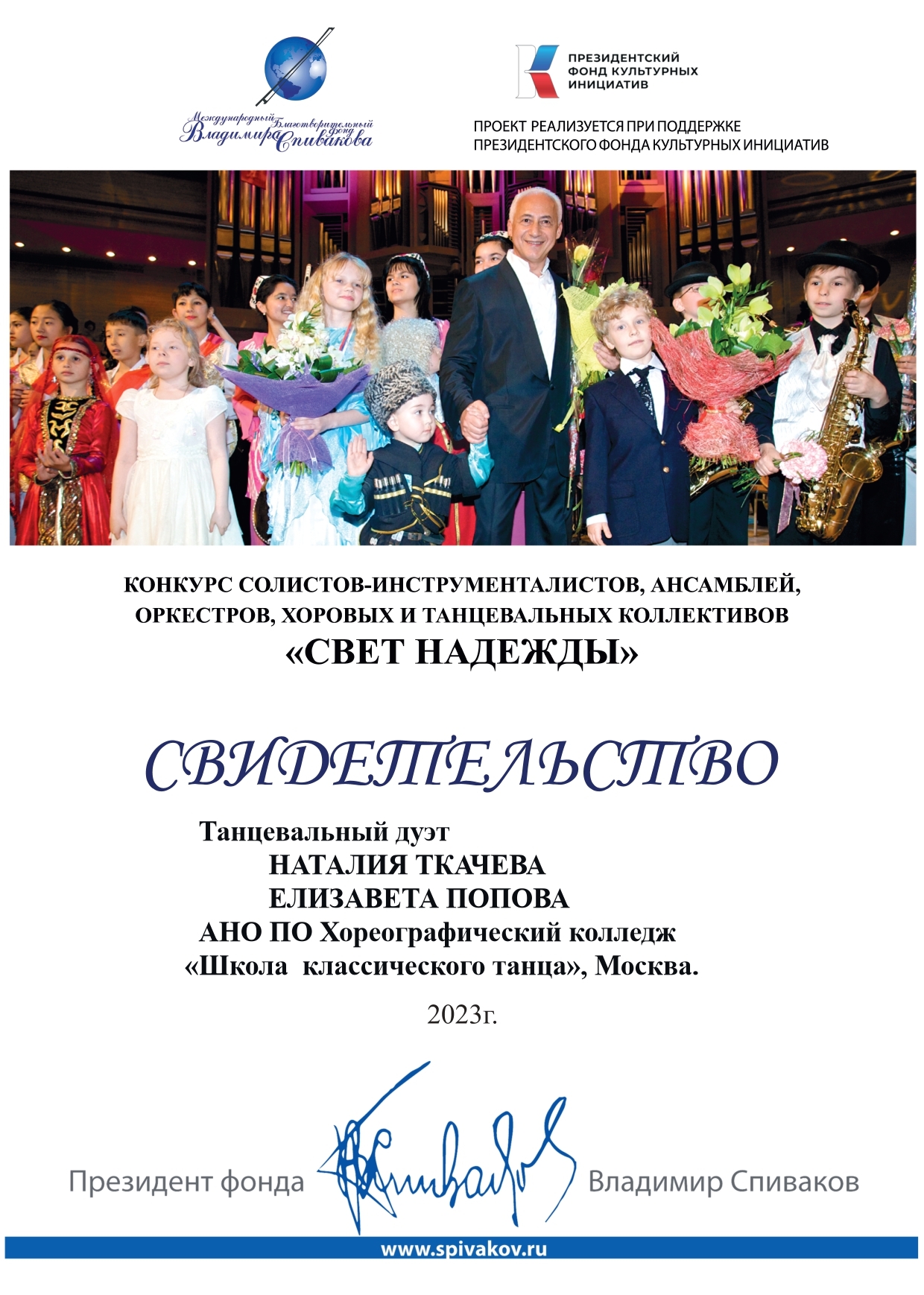 06 марта 2023 года. Свидетельство конкурса "Свет надежды" проект Международного благотворительного фонда Владимира Спивакова (МБФ Спивакова)
