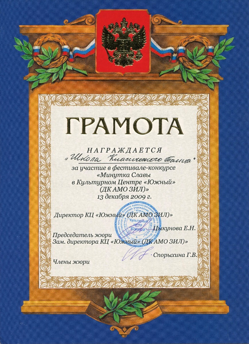 Грамота за участие в фестивале-конкурсе "Минута Славы в Культурном центре "Южный" (ДК АМО ЗИЛ)"