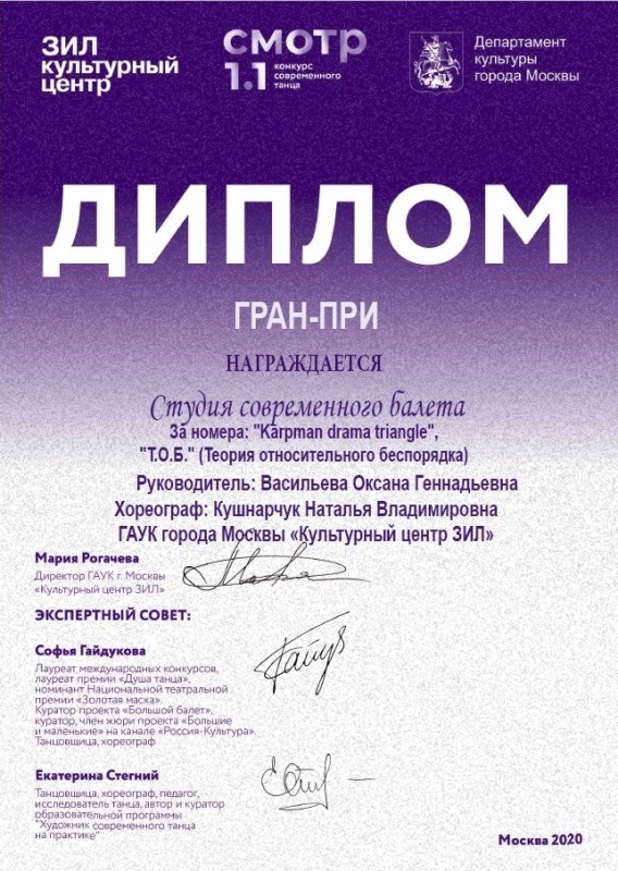 Диплом Гран-при Студии современного балета (участниками студии являются и воспитанники нашего колледжа) конкурса современного танца "СМОТР 1.1.", за номера: "Karpman drama triangle" и "Т.О.Б." (Теория относительного беспорядка).