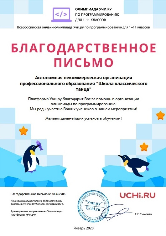 Благодарственные письма за помощь в организации олимпиад: "По программированию" и "Юный предприниматель" платформы УЧИ.РУ