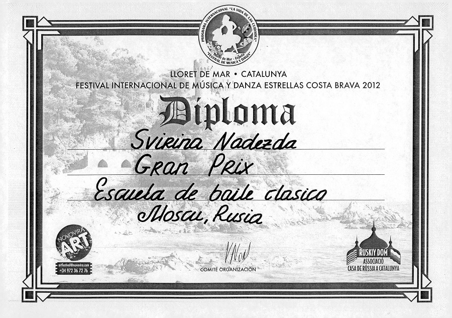 14-21 июля 2012 года Диплом Гран при Свириной Надежды XIII Международного фестиваля-конкурся "Festival de Muzica y Danza" (Каталония, Ллорет де Мар)