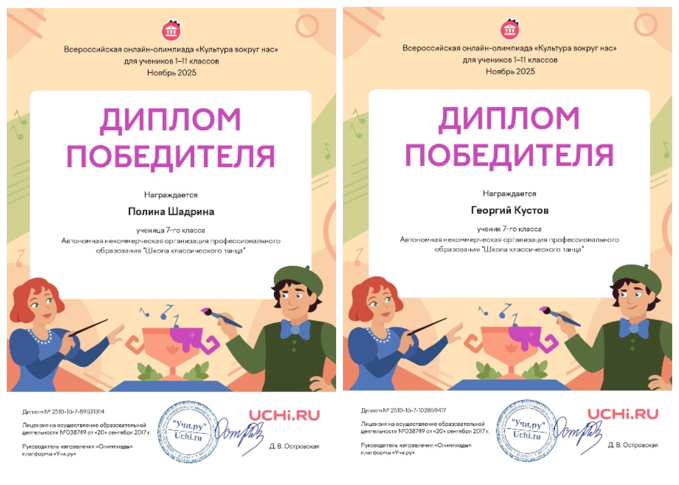 Ноябрь 2025г. Дипломы Победителя Шадриной Полины и Кустова Георгия всероссийской онлайн-олимпиады "Культура вокруг нас"