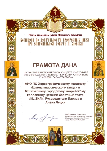 Грамота Русской православной Церкви Московского Патриархата дана за участие в заключительном концерте IX фестиваля воскресных школ и детских творческих коллективов г. Москвы "Пасха Христова"
