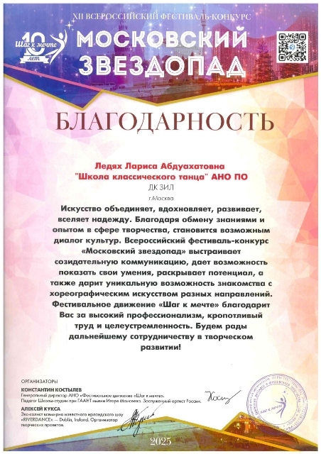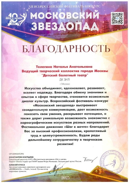 17 мая 2025 года. Благодарности Ледях Л.А. и Телегиной Н.А. XII Всероссийского фестиваль-конкурса "Московский звездопад"