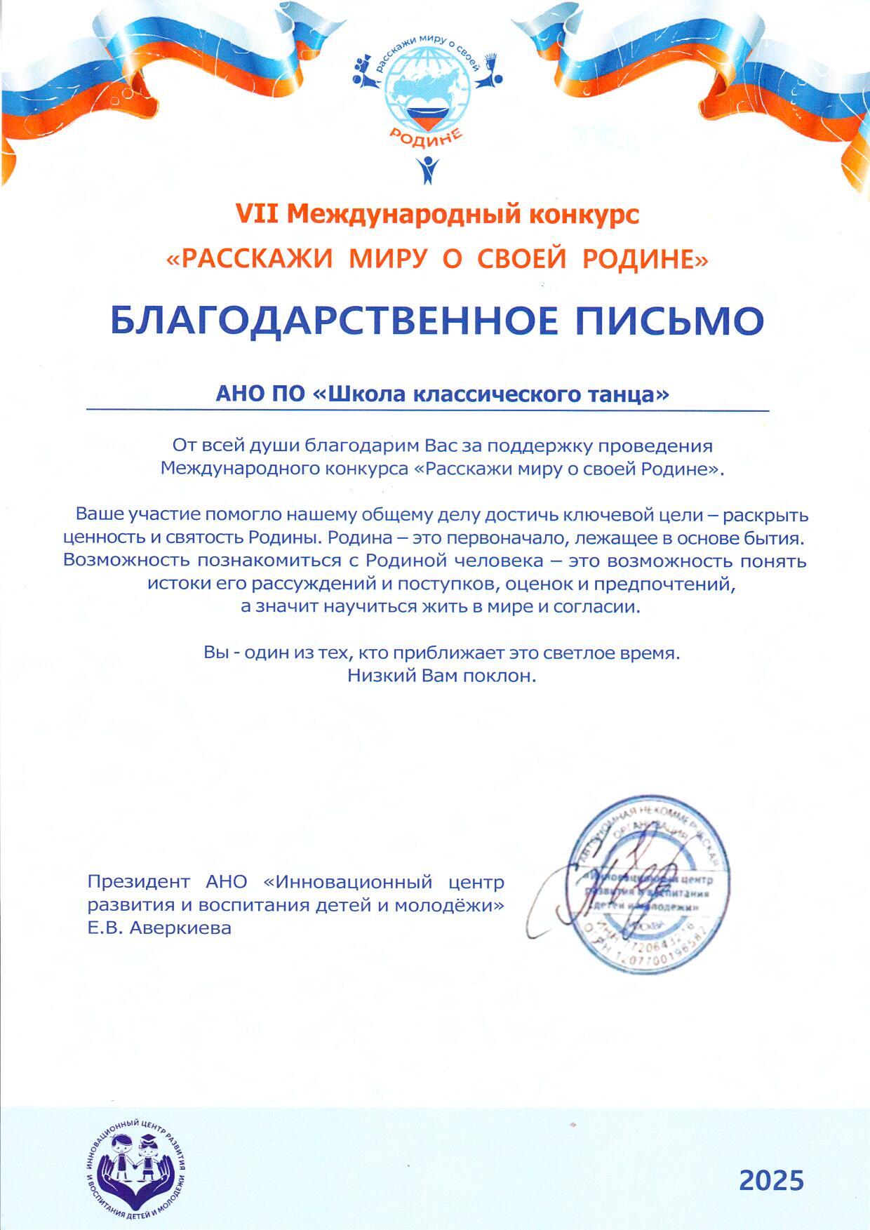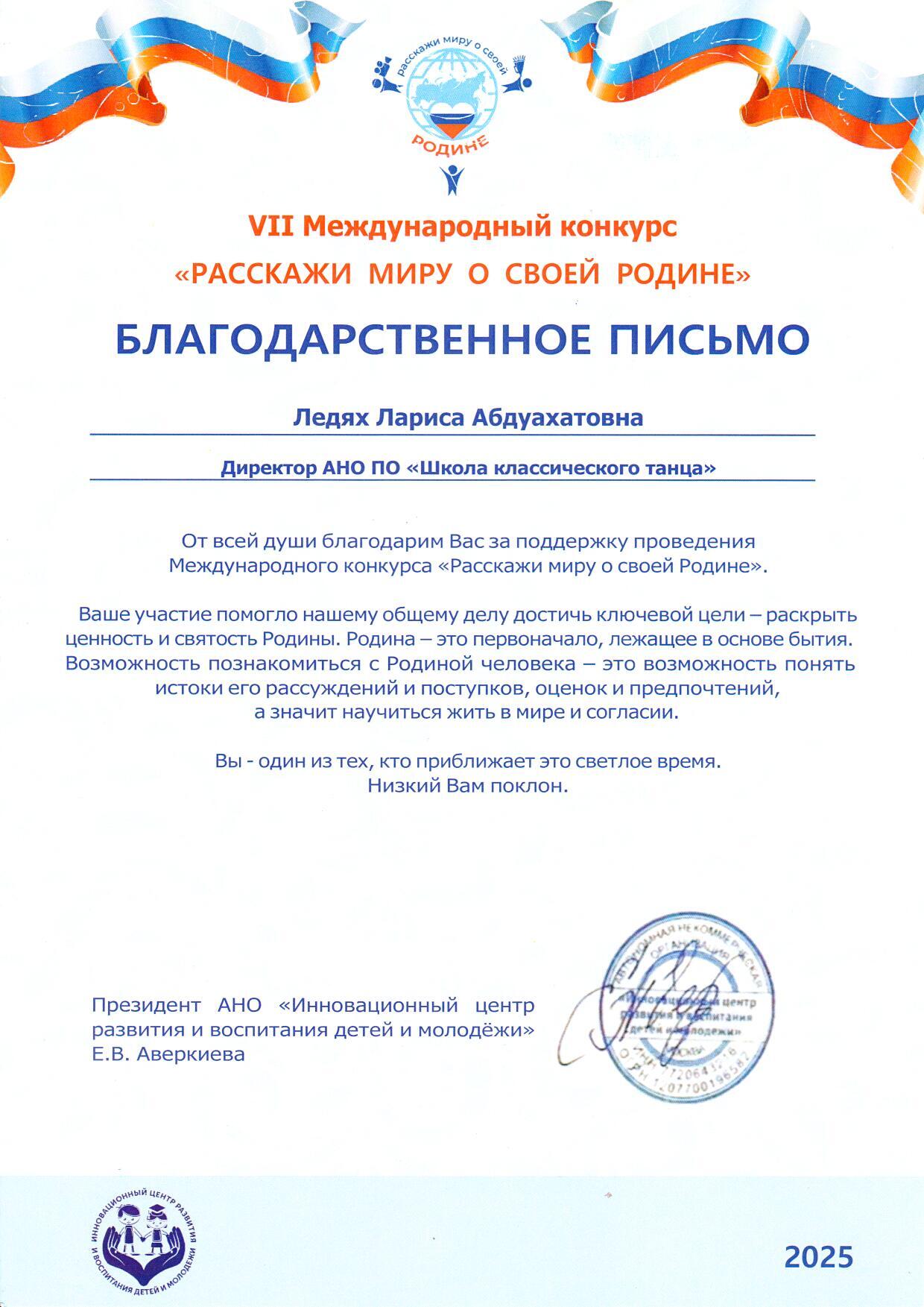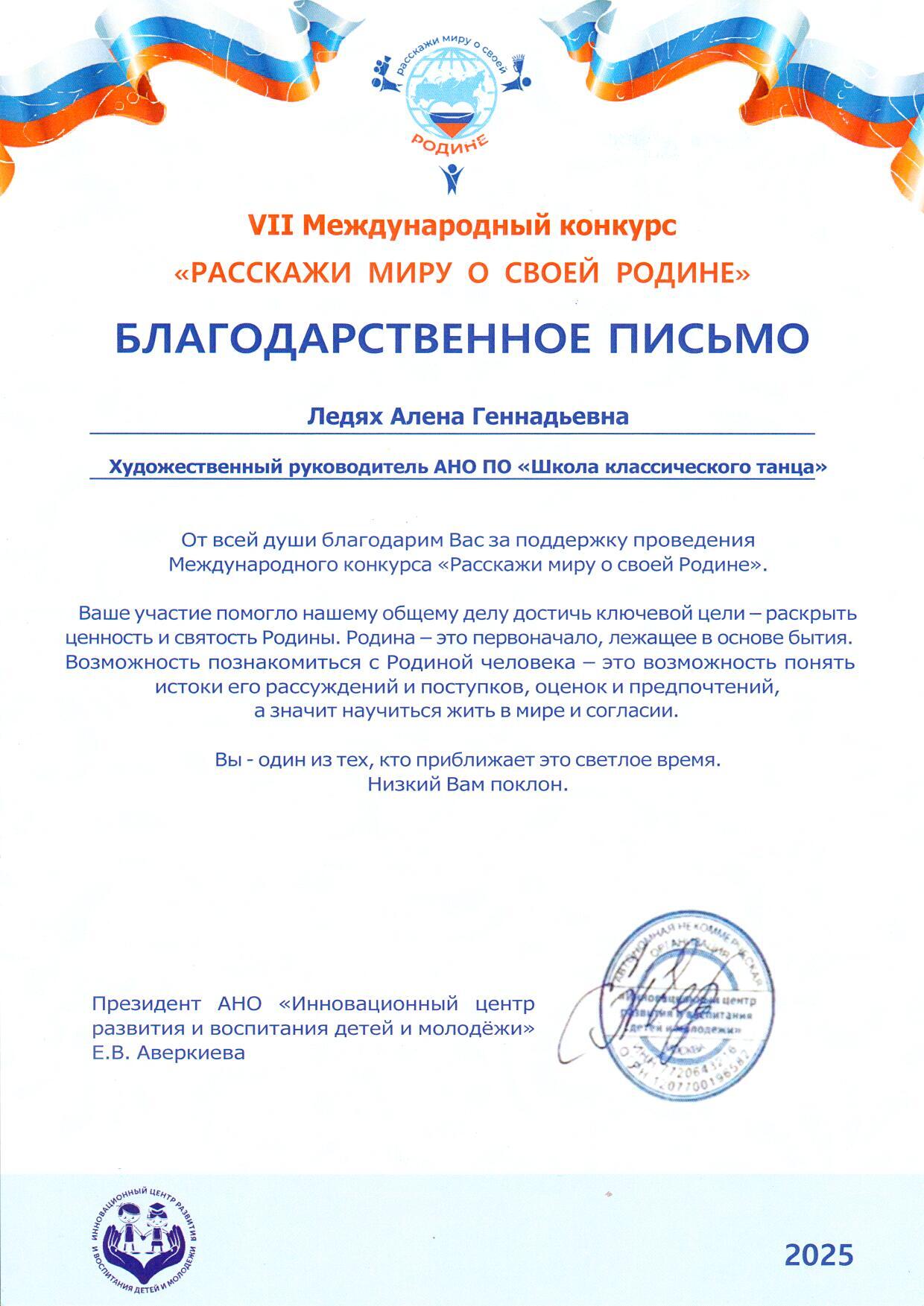 07 июня 2025 года. Благодарственные письма VII Международного конкурса "Расскажи Миру о своей Родине": Ледях Л.А., Ледях А.Г. и "Школа классического танца"