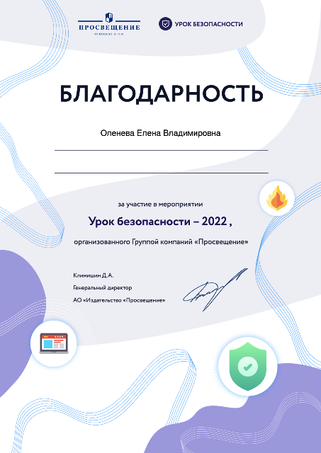 Благодарность Всероссийских Уроков Безопасности, которые проходили по теме Личная безопасность и были разработаны авторами ведущих отечественных проектов по наиболее актуальным тематикам ОБЖ и ГК «ПРОСВЕЩЕНИЕ»