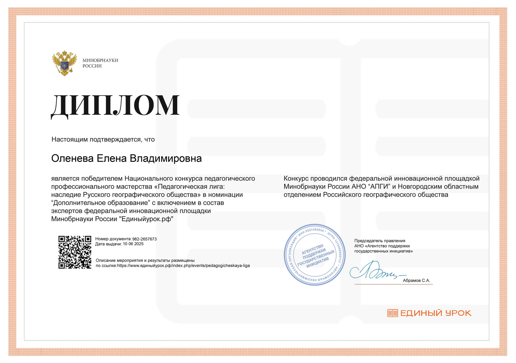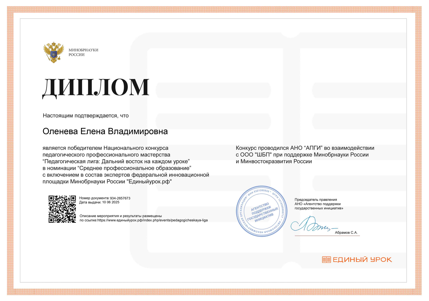 10 июня 2025 года. Дипломы Победителя Национального конкурса педагогического профессионального мастерства - Оленевой Елены Владимировны