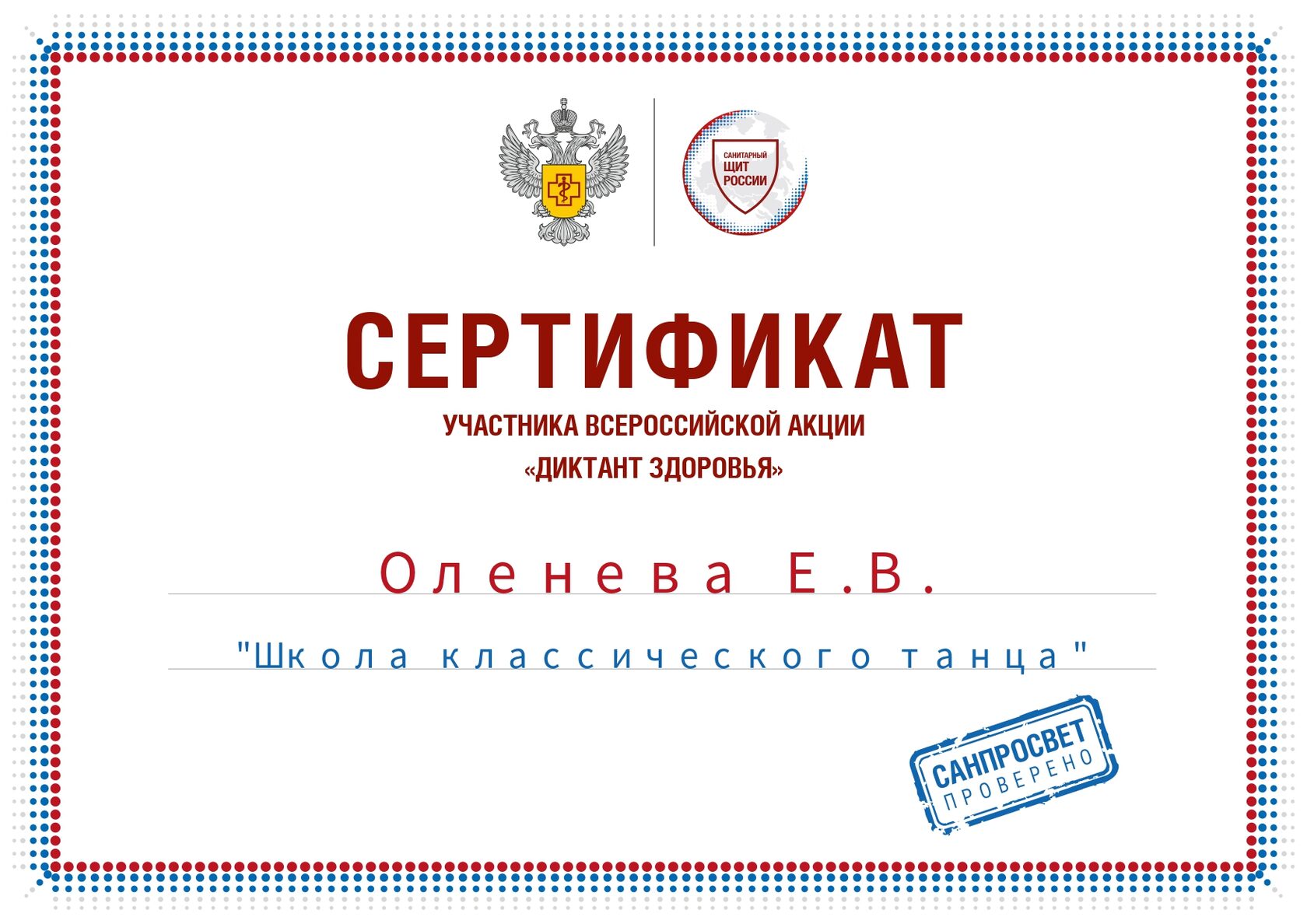 21 сентября 2024 года. Сертификаты «Санпросвет» «Диктант здоровья» - Оленевой Е.В.