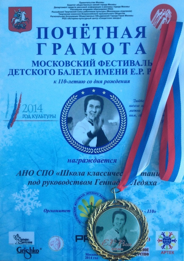 Почетная грамота за участие в Московском фестивале детского балета имени Е.Р. Россе, к 110-летию со дня рождения.